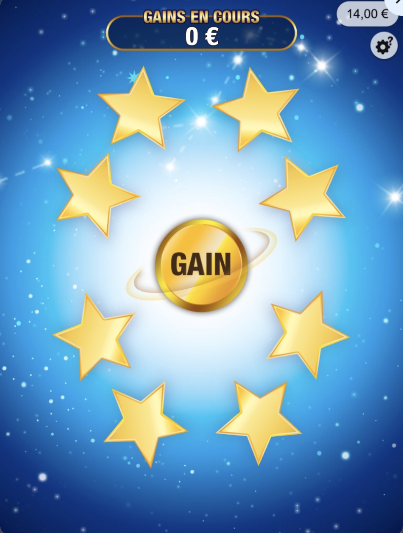 Après avoir validé la mise de 1€, l'écran de jeu principal s'affiche. L'ambiance est sobre et cosmique, centrée sur les éléments de jeu, sans fioritures inutiles. On retrouve :